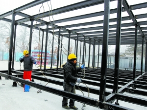 昨天,工人們在清華大學(xué)內(nèi)搭建“零耗能”住宅。從現(xiàn)在起至4月份,20名教授和50名學(xué)生將在清華游泳館東側(cè)的空地上搭建一所“零耗能”住宅,這是清華大學(xué)參加國際太陽能十項全能競賽的作品。目前,房子的整體鋼結(jié)構(gòu)已經(jīng)搭建完畢。本報記者吳鏑攝